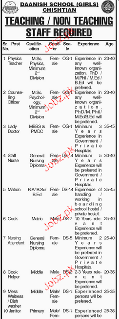 Teachers, Lady Doctors, Staff Nurses Job In Daanish School