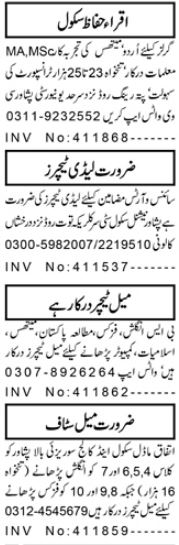 Private School invites applications for job positions advertised in daily Aaj dated 24 August 2022 for following vacancies in Peshawar, peshawar Khyber Pakhtunkhwa KPK Pakistan.