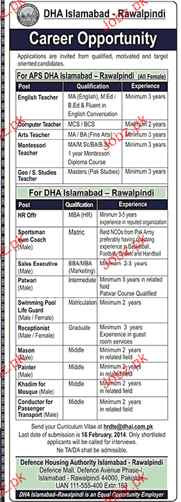 Teachers, Sales Executives, Patwari Job in DHA