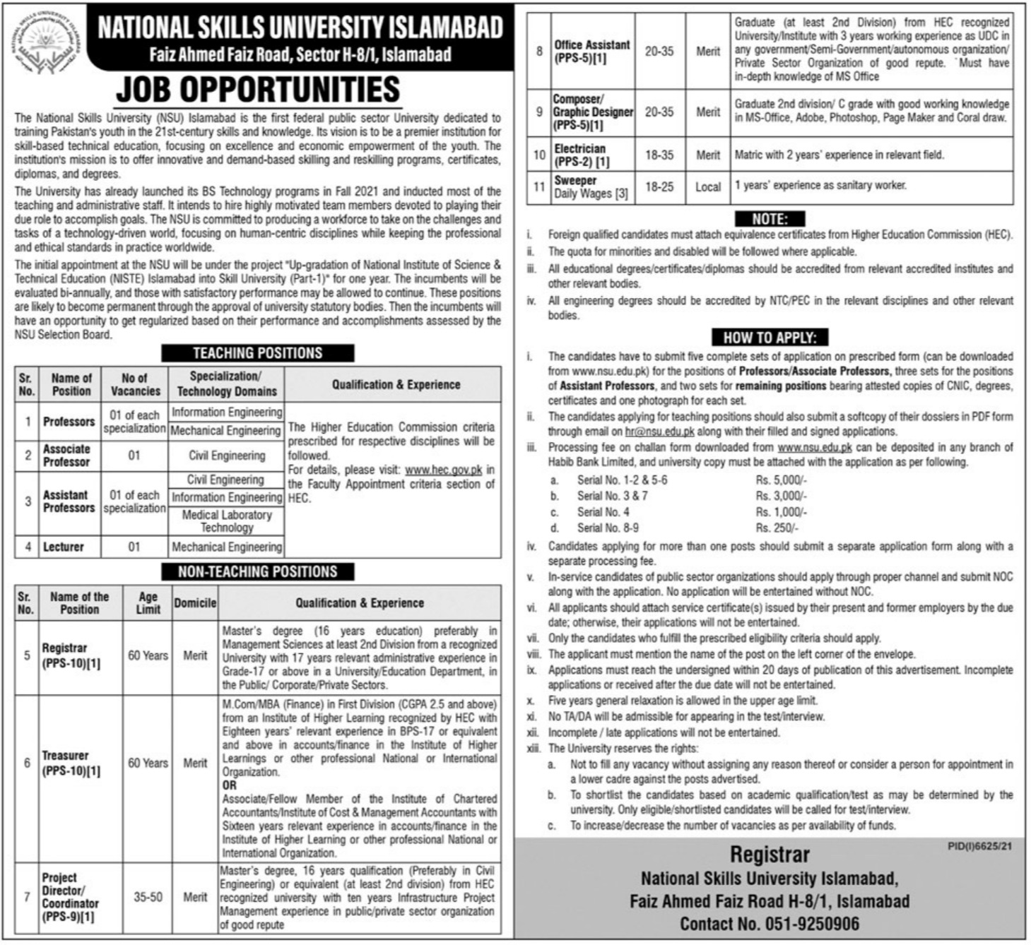 National Skills University Islamabad, islamabad Islamabad Pakistan invites applications from eligible candidates for the post of graphic designer, office assistant, project coordinator, associate professor, treasurer, sweeper, electrician, registrar, assistant professor, project director, lecturer, professor and composer as per advertisement of March 20, 2022 published in daily Ausaf Newspaper. Preferred Education is MBA, Phd, Master, B.E, Matric, Middle, Bachelor, M.com, MS and Mphil etc.