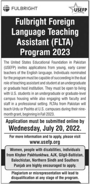 The United States Educational Foundation in Pakistan USEFP Rawalpindi, islamabad and rawalpindi Punjab Pakistan invites applications from eligible candidates for the post of foreign language teaching assistant program as per advertisement of June 26, 2022 published in daily Jang Newspaper. Preferred Education is Bachelor and Master etc.