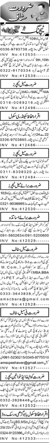 Vacant posts including pak study teacher, physic teacher, math teacher, english teacher, urdu teacher, science teacher, biology teacher, female teacher and male teacher are announced in Private Institute Peshawar, peshawar Khyber Pakhtunkhwa KPK Pakistan as per 7 September 2022 advertisement in daily Aaj Newspaper. Preferred Education is MS, MA, Master, Bachelor and M.sc etc.