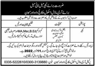 Vacant posts including maths teacher, general teacher, english teacher, chemistry teacher, islamiat teacher, physics teacher, biology teacher and sindhi teacher are announced in Army Model School & College Dadu, dadu Sindh Pakistan as per 11 November 2022 advertisement in daily Kawish Newspaper. Candidates with B.ed, MA and M.sc etc. educational background will be preferred.
