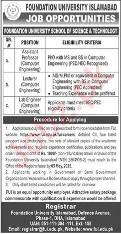 Foundation University Islamabad DHA Defence Phase 1 Islamabad, islamabad Islamabad Pakistan invites applications from eligible candidates for the post of lab engineer, lecturer and assistant professor as per advertisement of April 20, 2025 published in daily The News Newspaper. Educational qualifications required Phd, Mphil and MS etc.