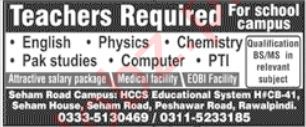 HCCS Educational System Peshawar Road Rawalpindi, rawalpindi Punjab Pakistan invites applications from eligible candidates for the post of english teacher, chemistry teacher, physics teacher, pti, pak studies teacher and computer teacher as per advertisement of April 6, 2025 published in daily Jang Newspaper. Educational qualifications required Master and Bachelor etc.