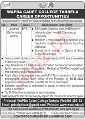 Wapda Cadet College Tarbela is looking for candidates for following posts as per job advertisement published in daily Dunya Newspaper of September 1, 2024 for location Tarbela, tarbela Khyber Pakhtunkhwa KPK Pakistan: