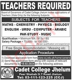 Cadet College Jhelum jobs advertisement dated about 28 January 2024 in daily The News Newspaper invites application for the vacant post of maths teacher, chemistry teacher, arabic teacher, computer teacher, music teacher, biology teacher, pak study teacher, english teacher, physics teacher, teacher and urdu teacher in Jhelum, jhelum Punjab Pakistan. Educational qualifications required Master, MA and M.sc etc.
