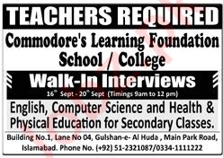 Commoders Learning Foundation School jobs advertisement dated about 15 September 2024 in daily Jang Newspaper invites application for the vacant post of computer teacher, teacher, science teacher, english teacher and health physical education teacher in Islamabad, islamabad Islamabad Pakistan. Preferred Education is Master and Bachelor etc.