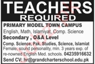 Grand Charter School is looking for candidates for following posts as per job advertisement published in daily Jang Newspaper of July 13, 2025 for location Model Town Lahore, lahore Punjab Pakistan: