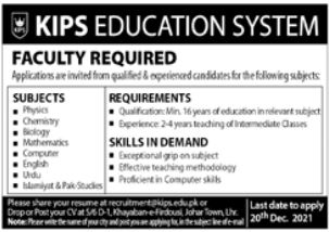 Kips Education System invites applications from qualified expert and experienced professionals for the post of Teacher, Physics Teacher, Chemistry Teacher, Biology Teacher, Mathematics Teacher, Computer Teacher, English Teacher, Urdu Teacher, Islamiyat Teacher, Pakistan Studies Teacher in Lahore.