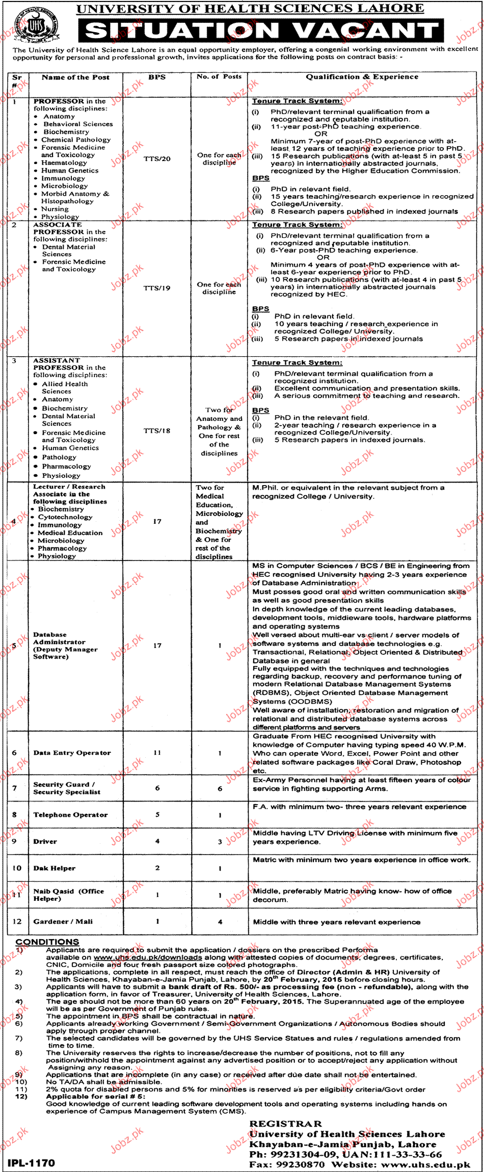 Professors, Associate Professors, Assistant Professors, Database Administrators, Lecturers, Telephone Operators, Security Guards and Drivers are required in University of Health Sciences in Lahore.
