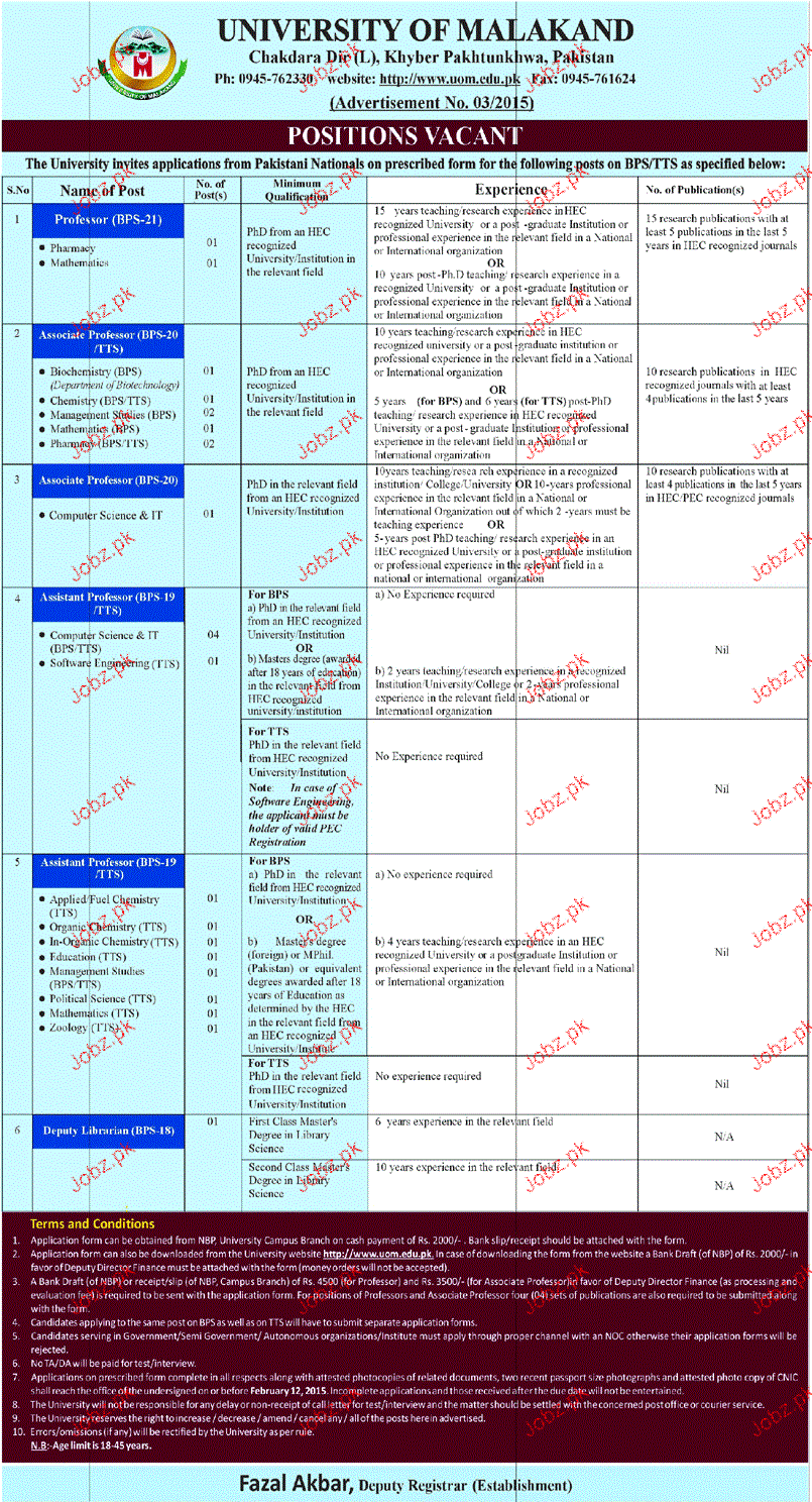 Professors, Associate Professors, Assistant Professors and Deputy Librarian are required in University of Malakand in Malakand.