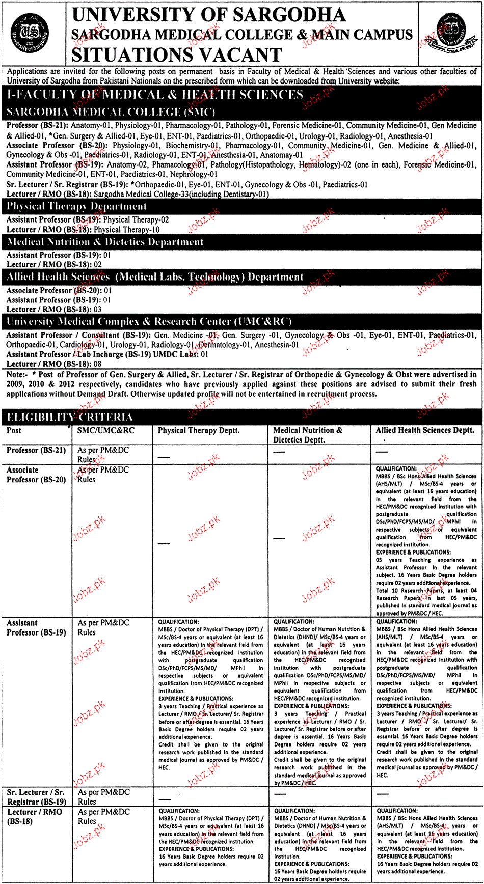 Professors, Associate Professors, Assistant Professors, Lectuers and Deputy Directors are required in University of Sargodha in Sargodha.