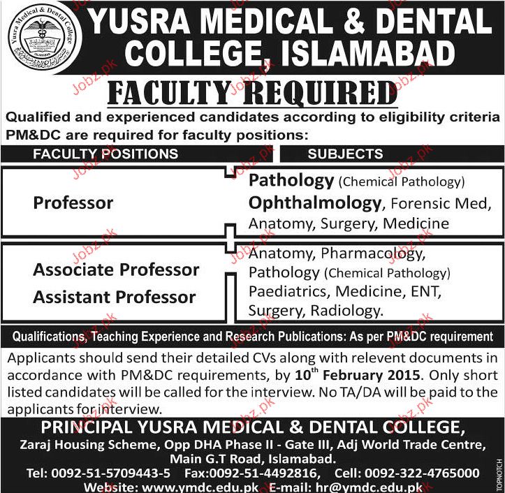 Teaching Jobs in Yusra Medical & Dental College