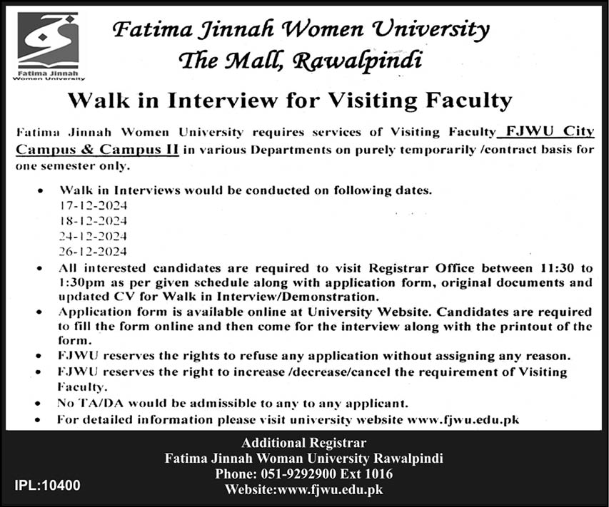 Fatima Jinnah Women University Rawalpindi, rawalpindi Punjab Pakistan invites applications from eligible candidates for the post of visiting faculty as per advertisement of December 6, 2024 published in daily Other Newspaper. Educational qualifications required MS, Phd and Mphil etc.
