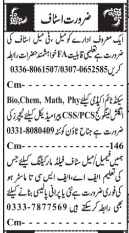 Vacant posts including css teacher, marketing officer, female staff, chemistry teacher, physics teacher, teacher, english language teacher, pcs teacher, biology teacher, field marketing officer, male staff and paramedical teacher are announced in Private Company Quetta, quetta Balochistan Pakistan as per 26 September 2022 advertisement in daily Jang Newspaper. Persons with Bachelor, Master, Matric and Intermediate etc. education can apply.