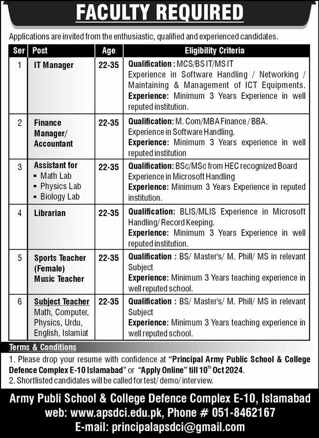 Vacant posts including sports tacher, accountant, english teacher, islamiat teacher, assistant for math lab, music teacher, math teacher, librarian, assistant for biology lab, it manager, computer teacher, physics teacher, assistant for physics lab, urdu teacher, finance manager and subject teacher are announced in Army Public School & College APS&C Islamabad, islamabad Islamabad Pakistan as per 3 October 2024 advertisement in daily Express Newspaper. Persons with MIT, MCS, Master, Bachelor and MS etc. education can apply.