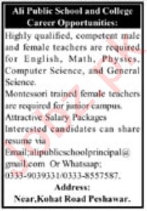 Ali Public School is looking for candidates for following posts as per job advertisement published in daily Mashriq Newspaper of April 3, 2023 for location Peshawar, peshawar Khyber Pakhtunkhwa KPK Pakistan: