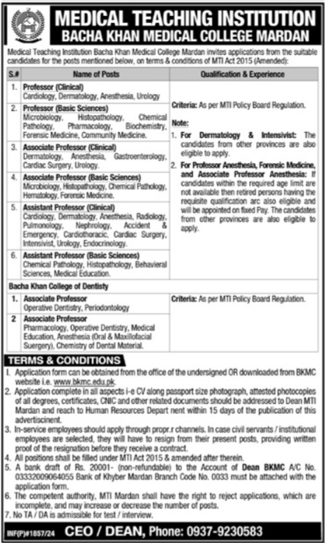 Vacant posts including professor, assistant professor and associate professor are announced in Medical Teaching Institution MTI Mardan, mardan Khyber Pakhtunkhwa KPK Pakistan as per 2 August 2024 advertisement in daily Mashriq Newspaper. Preferred Education is Others and MBBS etc.