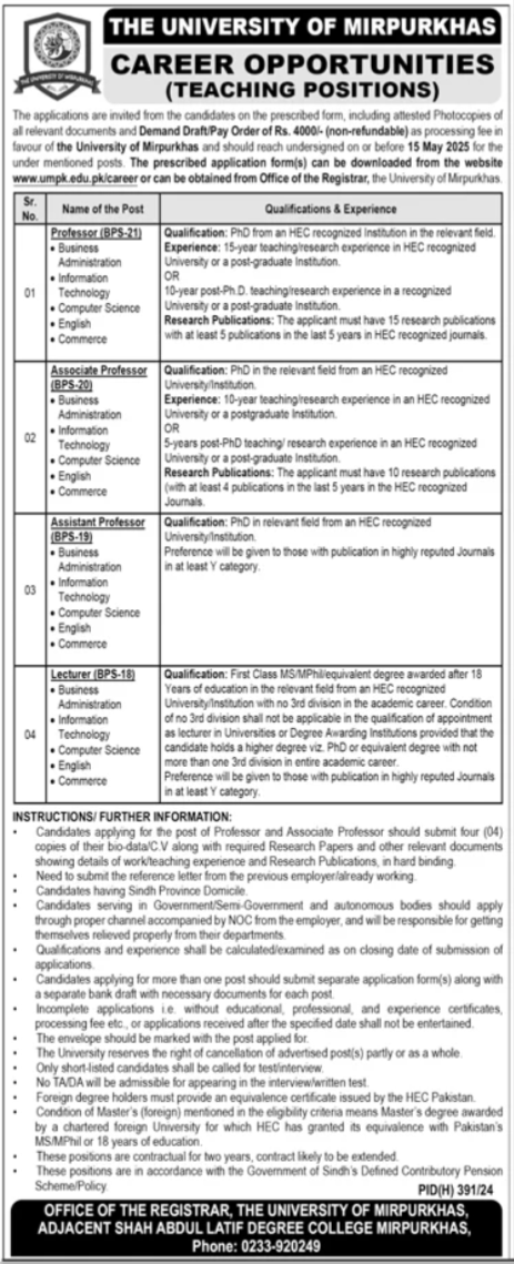 Vacancies in The University of Mirpurkhas Advertisement April 2025
