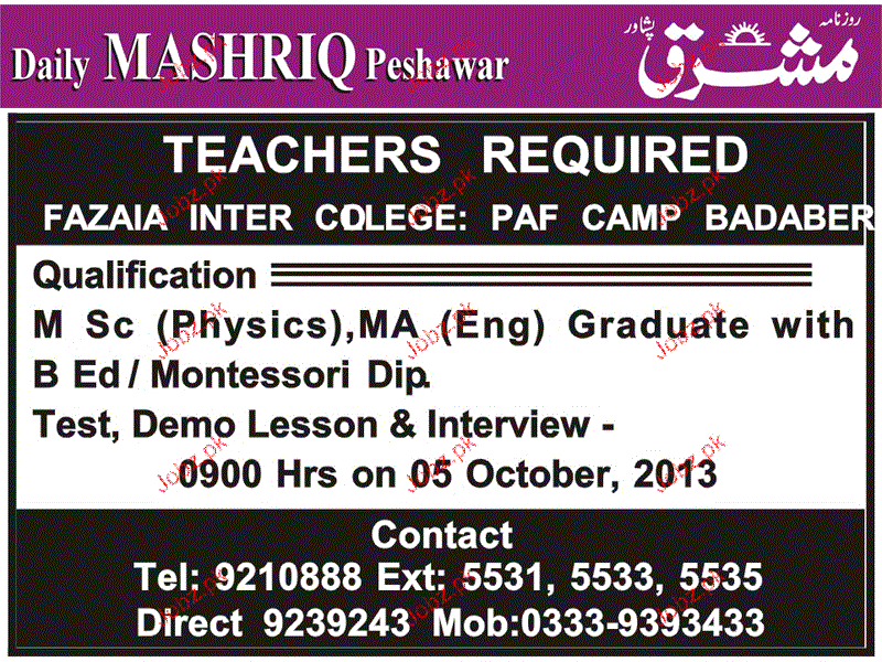 Teaching Staff Job in Fazaia Inter College PAF Camp Badaber