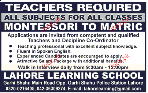 Teaching Staff are required in lahroe Learning School in Lahore.