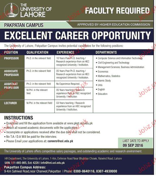 Apply as per details in job advertisement. Login to view further details of how to apply via https://www.jobz.pk online.
