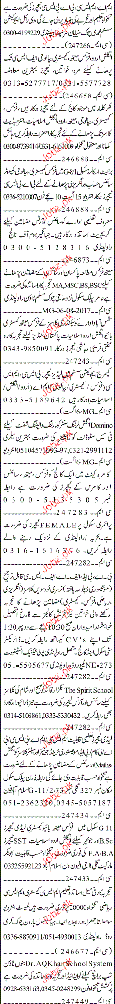 Teaching Staff For the Subject of English, Mathematics, Physics, Chemistry, Biology, Islamiat, Pak Studies are required in Rawalpindi. Ambitious Candidate Send their CV.