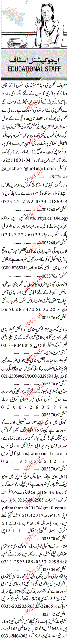 Teaching Staff For the Subject of English, Mathematics, Physics, Chemistry, Biology, Islamiat, Pak Studies and urdu are required in Karachi. Ambitious Candidate Send their CV.
