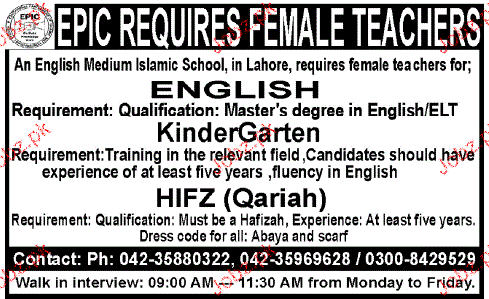 Teaching Staff required in EPIC in Lahore