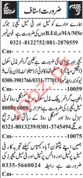A well reputed and well established company is looking for Teacher, English Teacher, Chemistry Teacher, Physics Teacher, Coordinator, Biology Teacher, Maths Teacher, Urdu Teacher in Quetta. Interested candidate can apply. Candidate must have experience in relevant field.