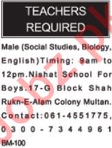 Latest Nishat Boys High School Teaching Posts Multan 2025