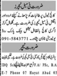 Private School invites applications for job positions advertised in daily Mashriq dated 25 November 2022 for following vacancies in Peshawar, peshawar Khyber Pakhtunkhwa KPK Pakistan.