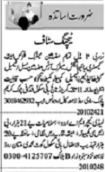Vacant posts including chemistry teacher, male teacher, female teacher, computer science teacher, islamiyat teacher, biology teacher, urdu teacher, mathematics teacher, english teacher, fine arts teacher, physics teacher, teacher, science teacher and arts teacher are announced in Private School Lahore, lahore Punjab Pakistan as per 23 October 2024 advertisement in daily Dunya Newspaper. Persons with Master and Bachelor etc. education can apply.
