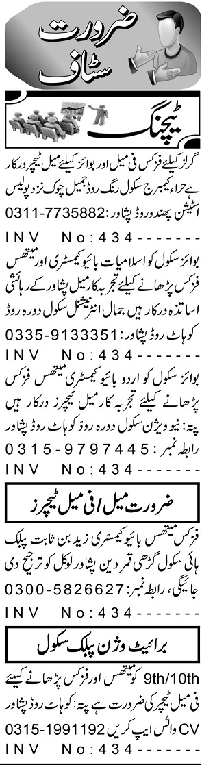 Vacant posts including male teacher, computer teacher, biology teacher, islamiyat teacher, chemistry teacher, pakistan studies teacher, mathematics teacher, teacher and physics teacher are announced in Private School Peshawar, peshawar Khyber Pakhtunkhwa KPK Pakistan as per 19 September 2024 advertisement in daily Aaj Newspaper. Preferred Education is Master and Bachelor etc.