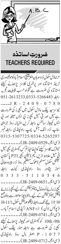 Private School jobs advertisement dated about 22 October 2024 in daily Jang Newspaper invites application for the vacant post of paksitan studies teacher, computer science teacher, physics teacher, male teacher, urdu teacher, teacher, biology teacher, chemistry teacher, female teacher, islmiyat teacher, montessori teacher, english teacher and maths teacher in Rawalpindi, rawalpindi Punjab Pakistan. Candidates with Bachelor and Master etc. educational background will be preferred.