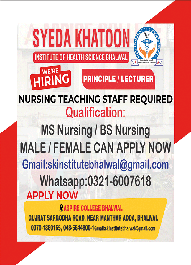 Syeda Khatoon Institute of Health Science invites applications for job positions advertised in daily Nawaiwaqt dated 30 August 2025 for following vacancies in Bhalwal, bhalwal Punjab Pakistan.