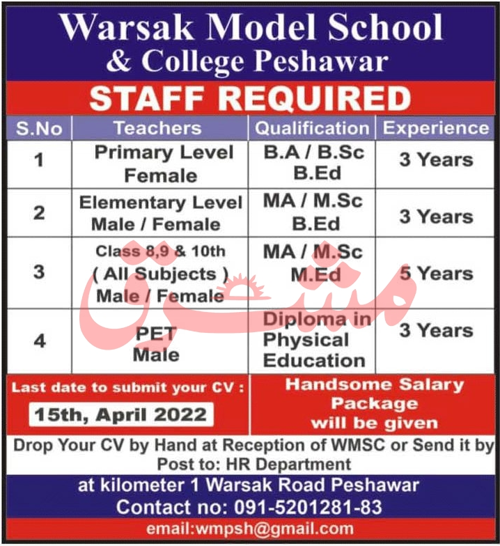 Warsak Model School & College Peshawar, peshawar Khyber Pakhtunkhwa KPK Pakistan invites applications from eligible candidates for the post of elementary level teacher, male pet, class eight nine ten subjects teacher and female primary level teacher as per advertisement of April 1, 2022 published in daily Mashriq Newspaper. Persons with MA, Others, B.ed, BA, M.sc and M.ed etc. education can apply.