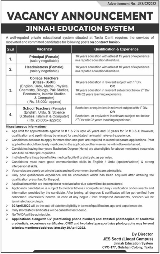 Jinnah Education System JES invites applications for job positions advertised in daily The News dated 17 April 2022 for following vacancies in Taxila, taxila Punjab Pakistan.