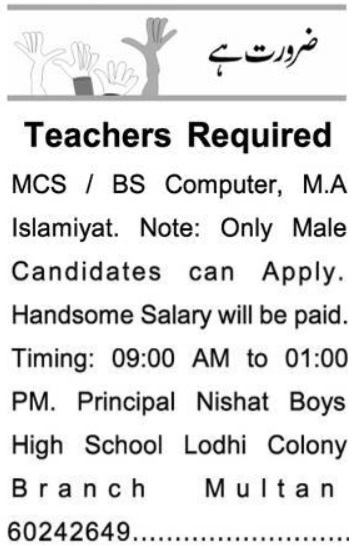 Nishat Boys High School jobs advertisement dated about 29 December 2023 in daily Express Newspaper invites application for the vacant post of teacher, computer teacher and islamiyat teacher in Multan, multan Punjab Pakistan. M.sc, Master and Bachelor etc. educational qualification will be preferred.
