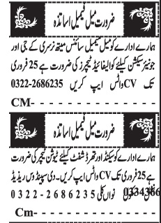 Private School jobs advertisement dated about 14 February 2022 in daily Jang Newspaper invites application for the vacant post of math Teacher, Nursery Teacher, Pre School Teacher, Science Teacher, Teacher and Tution Teacher in Quetta Balochistan Pakistan. Bachelor and Master etc. educational qualification will be preferred.