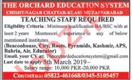 The Orchard Education System is looking for Teacher, English Teacher, Mathematics Teacher, Chemistry Teacher, Physics Teacher, Biology Teacher, Science Teacher, Arts Teacher, Islamiyat Teacher, Pakistan Studies Teacher Accountant, Coordinator, Receptionist in Muzaffarabad.
