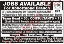 Efu Life Assurance Ltd Abbottabad, abbottabad Khyber Pakhtunkhwa KPK Pakistan invites applications from eligible candidates for the post of team head and consultant as per advertisement of August 1, 2022 published in daily Aaj Newspaper. Persons with Bachelor etc. education can apply.
