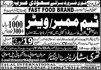 Vacant posts including waiter and team member are announced in Three Star Trade Test & Training Centre Makkah, riyadh Saudi Arabia as per 15 February 2024 advertisement in daily Express Newspaper. Matric and Intermediate etc. educational qualification will be preferred.