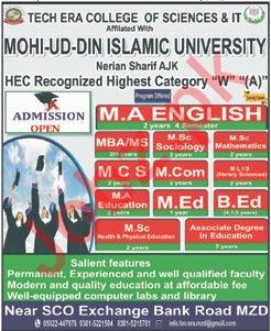 Tech Era College of Sciences & IT Affiliated with Mohi-ud-Din Islamic University Nerian Sharif AJK offering admissions for MA English, MBA, MS, MSc Sicology, MSc Mathematics, MCS, M-Com, MA Education, M.Ed, B.Ed, MSc Degree. Read newspaper ad for exact details.