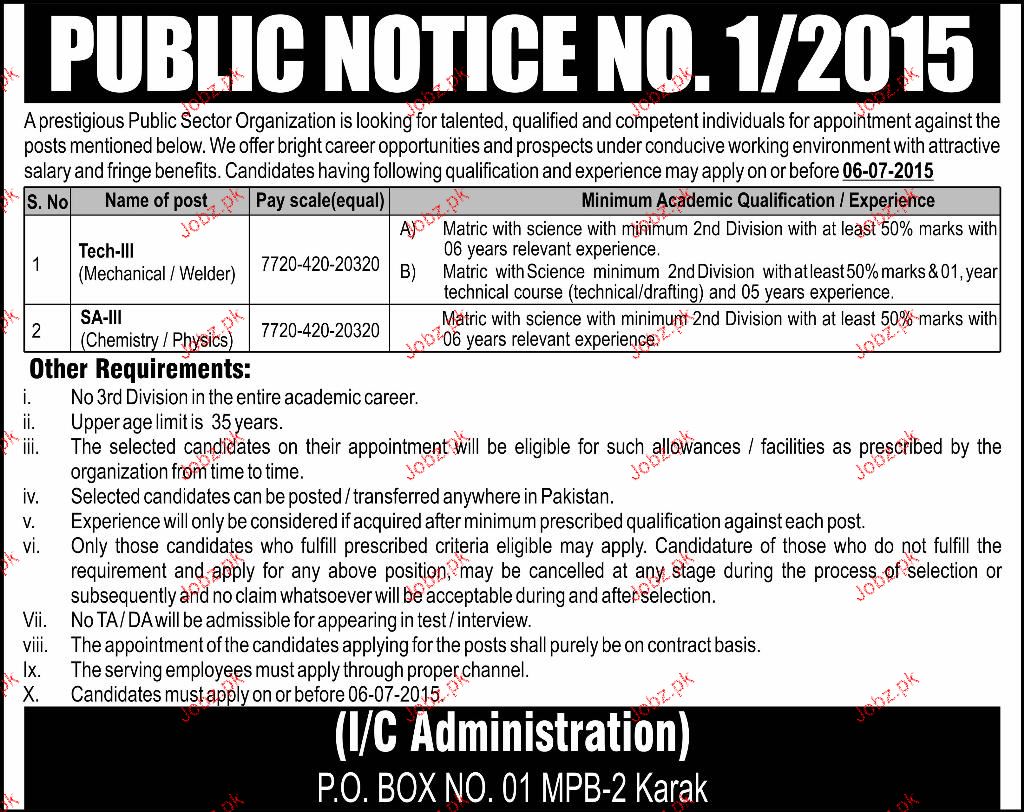 Tech-III and SA-III are required in Public Sector Organization in Karak.