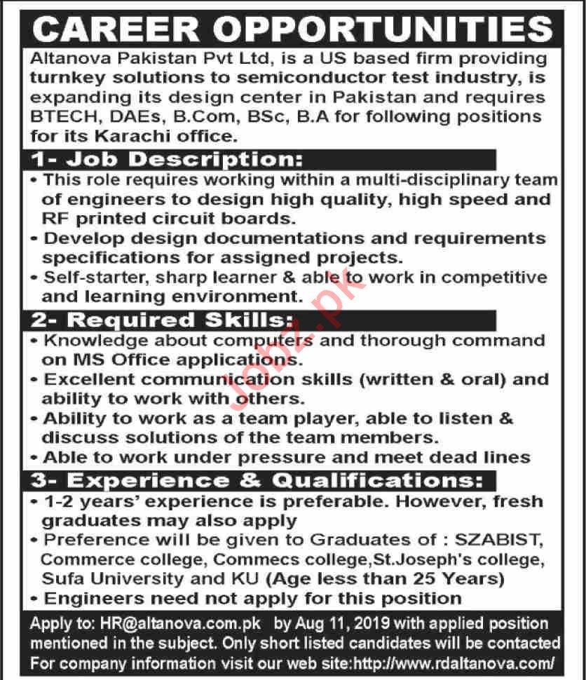 Vacancies in Altanova Pakistan Pvt Ltd Advertisement July 2019
