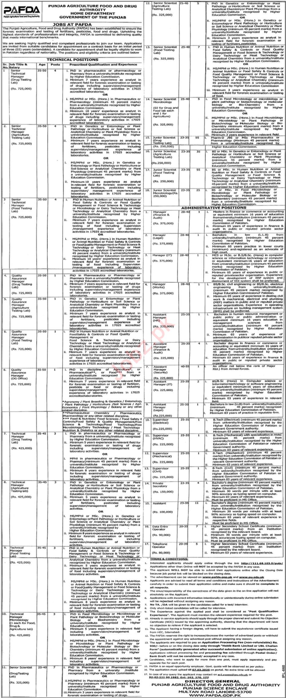 Vacancies in Punjab Agriculture Food & Drug Authority PAFDA Advertisement February 2025