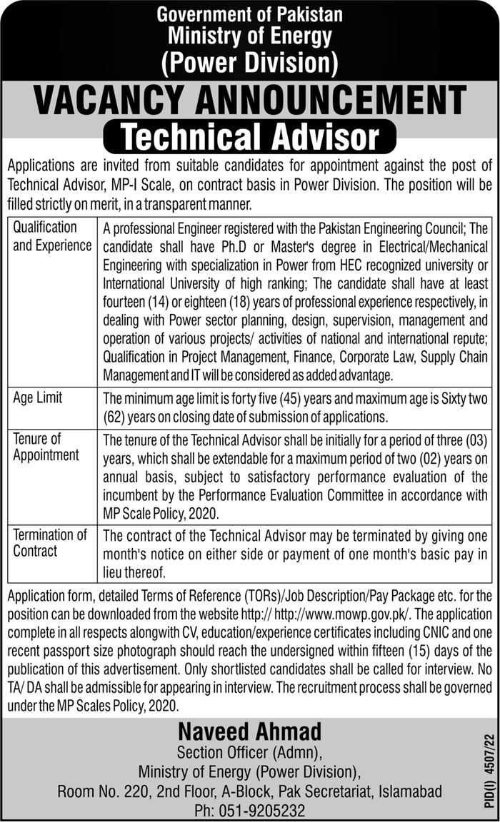 Technical Advisor Job At Ministry Of Energy Power Division