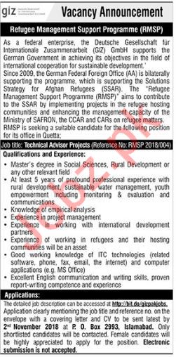 Vacancies in GIZ Pakistan Advertisement October 2018